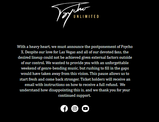 With a heavy heart, we must announce the postponement of Psycho X. Despite our love for Las Vegas and all of our devoted fans, the desired lineup could not be achieved given external factors outside of our control. We wanted to provide you with an unforgettable weekend of genre-bending music, but rushing to fill in the gaps would have taken away from this vision. This pause allows us to start fresh and come back stronger. Ticket holders will receive an email with instructions on how to receive a full refund. We understand how disappointing this is, and we thank you for your continued support.