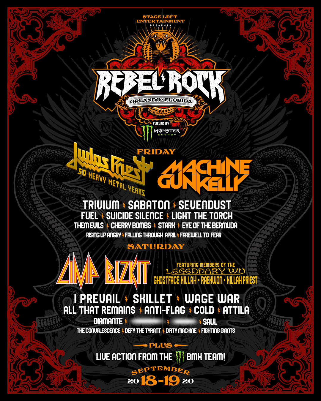 Rebel Rock Fest Presented By Monster Energy is the news festival added to the fall concert season. The fest has added Friday night headline artist Machine Gun Kelly, and Saturday act Legendary Wu, featuring Wu-Tang Clan members Ghostface Killah, Raekwon The Chef, and Killah Priest. They join a stacked lineup that already includes Judas Priest on their 50 Years of heavy Metal Tour, Limp Bizkit, Trivium, Sabaton, Sevendust, Fuel, I Prevail, Skillet, Wage War, All That Remains, Anti-Flag, Cold, Attila, Diamante, Them Evils, Cherry Bombs, Saul and more! The fest takes place on September 18th and 19th 2020 at The Orlando Amphitheater at Central Florida Fairgrounds.