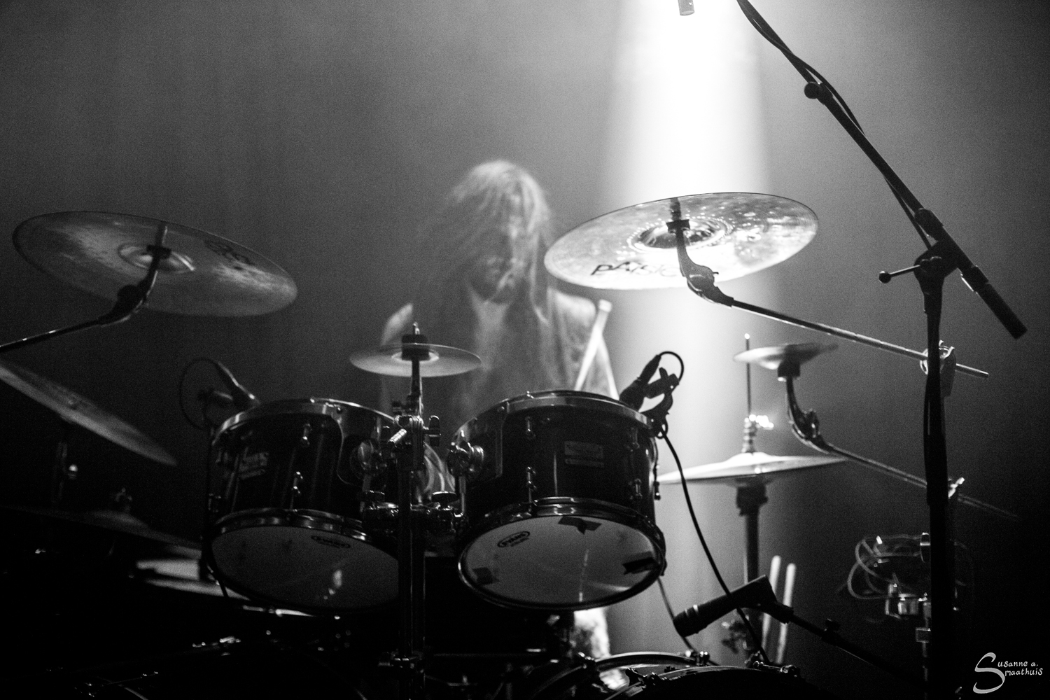 Closing the night were Sortilegia, who were completely unknown to me. A mesmerizing shrine is slowly build up by the Canadian duo, with candles, incense, a human skull perched on a chalice and the aptly named Castiello del Diablo wine behind it. Consisting only of a drummer and vocalist/guitarist the band produces a mesmerizing sound and complexity with such little means. There is no margin of error for them, as any flaw in the music would painfully stand out with so few instruments, but they pull it off excellently well. The dark robes and blood covered face of their blonde singer add a certain almost Lovecraftian cultist feel to the presence, her eye-rolling only adding to the madness. For me, these were certainly an unexpected gem. I’d never seen Almyrkvi before either, but I had an inkling I’d like them. This took me by utter surprise. Sadly, the room was already emptying as they started, either with people needing to catch that last train, or not interested in this relatively unknown and mad that a band played after such a thunderous performance by Sinmara. However, if you like the occult side of things, and aren’t scared to be pulled into a whirlwind of screams, guitar layers and icy drums, I thoroughly recommend seeing these guys if they play nearby.