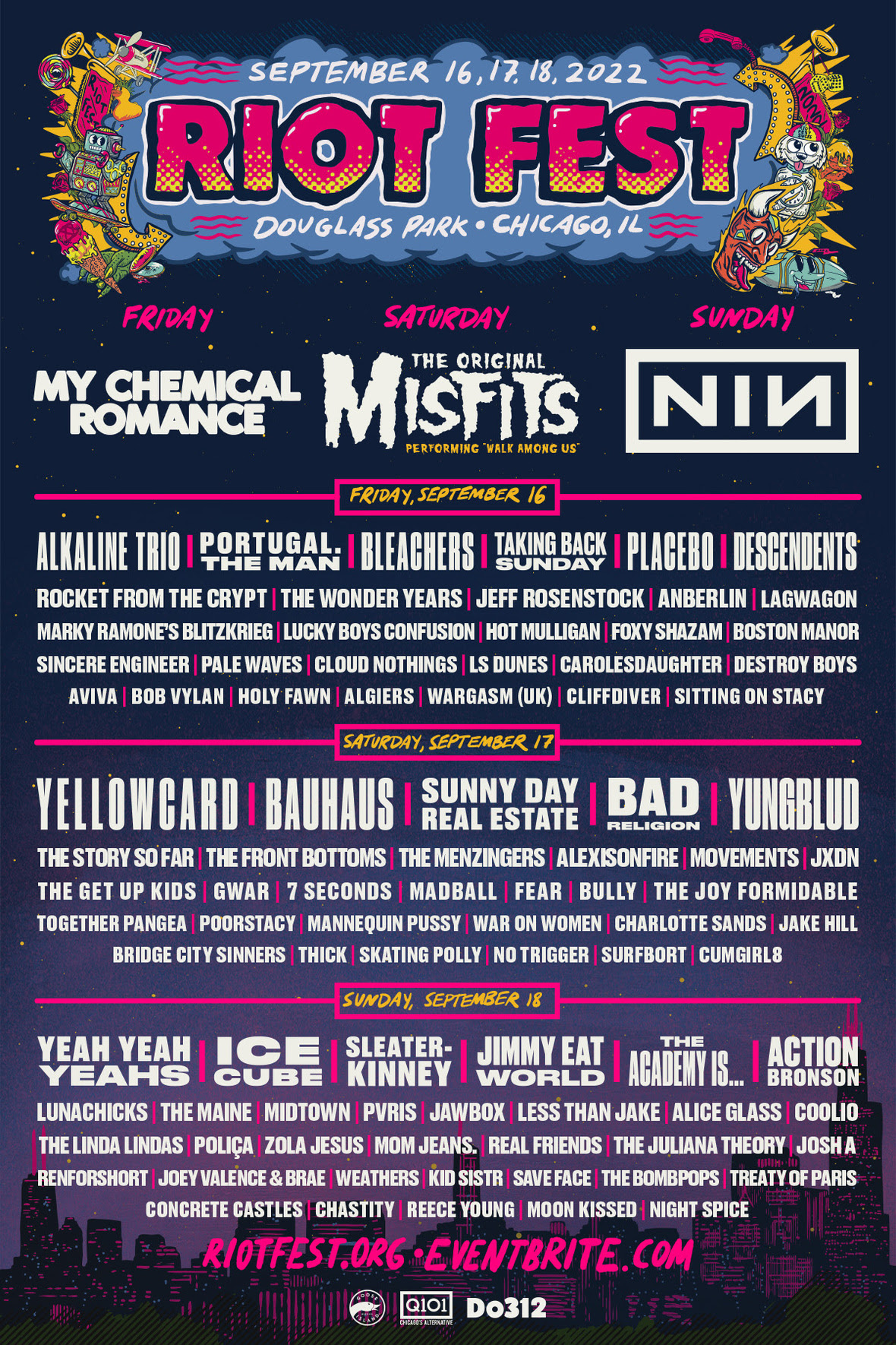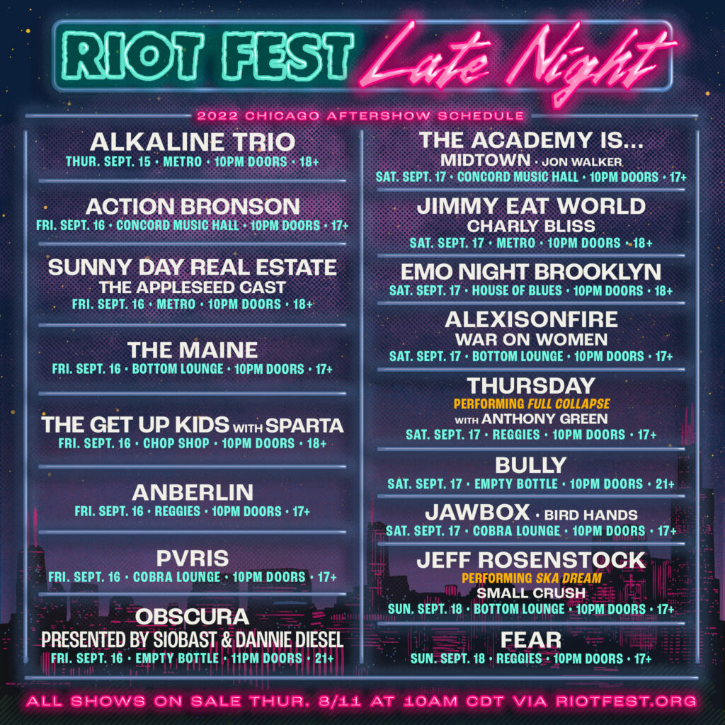 Riot Fest has announced their full slate of late night “After Shows” with shows including Thursday with Anthony Green, Fear, Bully, The Maine, Alexisonfire with War On Women, Jeff Rosenstock, Pvris, Alkaline Trio, Sunny Day Real Estate, Jimmy Eat World, Action Bronson, The Academy Is… with Midtown, The Get Up Kids with Sparta and more! Pre-sales begin tomorrow and these shows always sell out fast. Artists usually take the opportunity to create special shows, and setlists compared with their usual RF performances. Individual tickets and info is on sale at the link below.