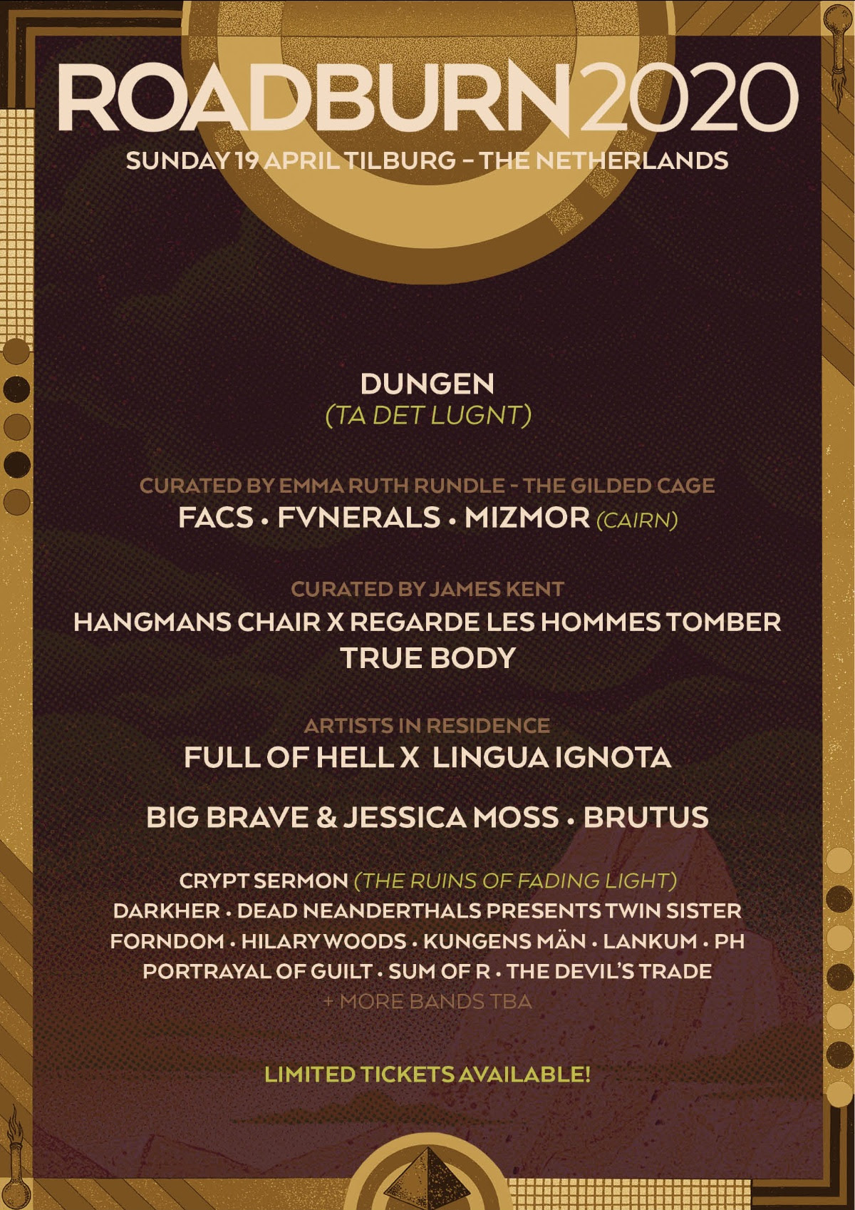 All tickets to Roadburn 2020 are now sold out except for Sunday day tickets. Sunday day tickets are priced at €60.50. More information about tickets and accommodation options can be found here: https://roadburn.com/tickets/