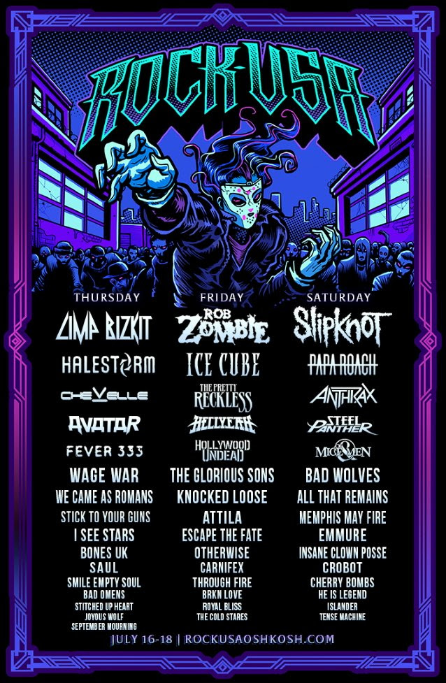 Rock USA and its sister festival Country USA has been forced to cancel their 2020 events due to the coronavirus (COVID-19) pandemic. The festival, one of the biggest in the US, was to have celebrated its 10th-anniversary edition this summer, and was going to take place July 16-18 at Ford Festival Park in Oshkosh, Wisconsin. Of the 40 bands and headliners and support acts included Limp Bizkit, Slipknot, Rob Zombie (headlining for a 3rd straight year), Halestorm, Ice Cube, Papa Roach, Anthrax, Chevelle, Avtar, Feever333, Hellyeah, Steel Panther, Knocked Loose, Bad Wolves, Attila and more. Hypervibe, Inc. is the festival promoter and has vowed to attempt to rebook the fest.