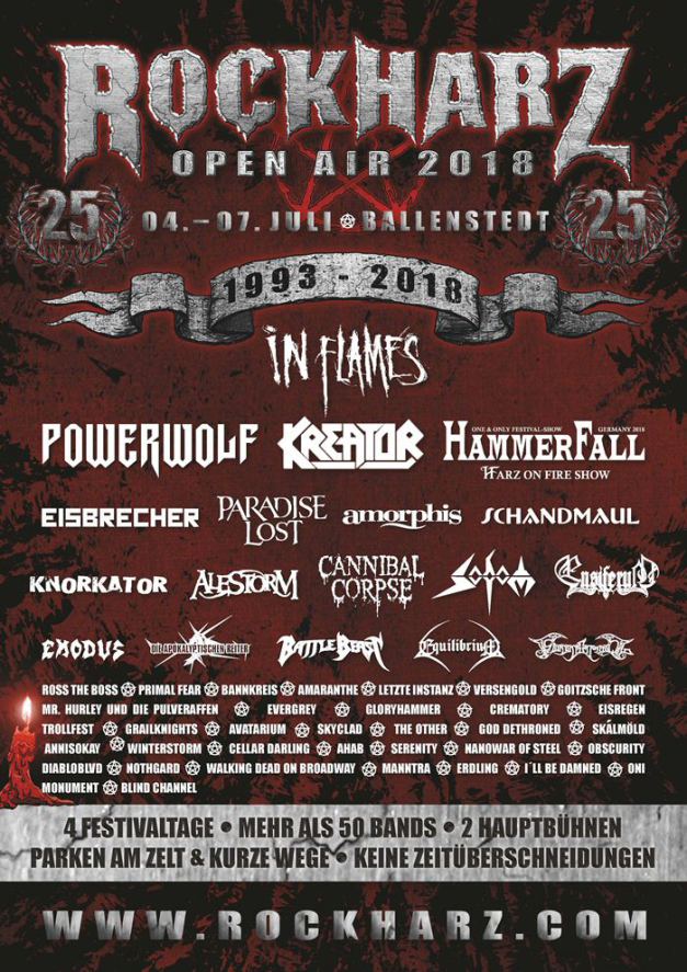 This year’s Rockharz Open Air is sold-out, faster than ever before. As preparations begin to host the 25th edition of the festival, it will take place from July 4th to July 7th, 2018 in Ballenstedt. The fest is headlined by In Flames, Powerwolf, Kreator, Hammerfall, Eisbrecher, Paradise Lost, Amorphis, Knorkator, Schandmaul, Cannibal Corpse, Alestorm, Ensiferum, Exodus, Sodom, Equilibrium, Die Apokalyptischen Reiter, Finntroll, Battle Beast, Amaranthe, Bannkreis, Gloryhammer and many more. You can see the final poster below.