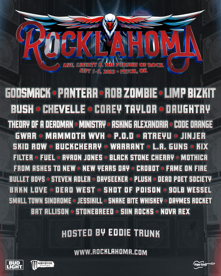 The music lineup for Rocklahoma is as follows: Pantera, Godsmack, Rob Zombie, Limp Bizkit, Bush, Chevelle, Corey Taylor, Daughtry, Theory of a Deadman, Ministry, Asking Alexandria, Code Orange, GWAR, P.O.D., Mammoth WVH, Atreyu, Jinjer, Skid Row, Buckcherry, Warrant, L.A. Guns, Kix, Filter, Fuel, Ayron Jones, Black Stone Cherry, Mothica, From Ashes To New, New Years Day, Crobot, Fame On Fire, BulletBoys, Dayseeker, Plush, Dead Poet Society, Brkn Love, Steven Adler, Dead West, Shot Of Poison, Small Town Sindrome, 90LB Wrench, Jessikill, Snake Bite Whisky, Daymes Rocket, Bat Alliance, Stonebreed, Siin and Nova Rex.