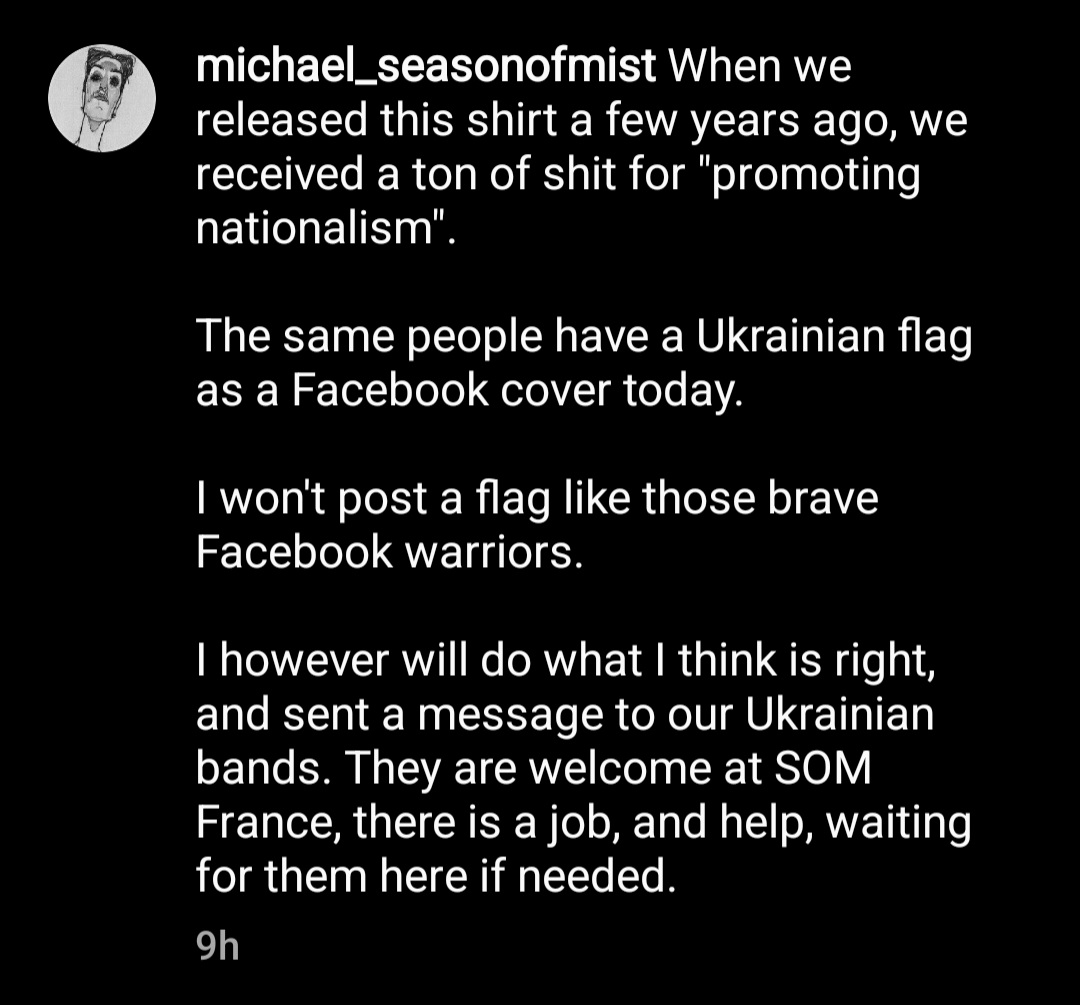 In the wake of the invasion of Ukraine by Russia (aided by Belarus), Season of Mist’s founder and CEO Michael Berberian has made a post offering support to those artists affected by the conflict, but also work, and refuge a SOM’s office in France. SOM label has several bands from Ukraine, most notably Drudkh. We’d like to shout out this amazing and kind gesture and implore other labels with the ability to mirror this, to do so, and for music media to report this amazing news to help spread the word. We need more actions like this, rather than empty gestures at this critical time in the world.