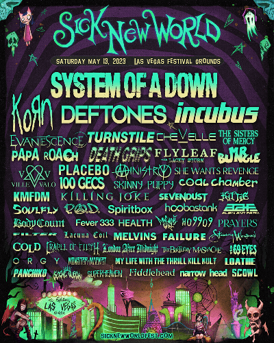 System Of A Down, Incubus, Korn, Evanescence and Deftones will headline Sick New World Festival this weekend, a new music festival featuring some of the biggest names in Nu-Metal, Goth Rock, Industrial Metal, and some modern bands as well! Among the dozens of bands on the bill, it will mark the reunions of both Flyleaf with Lacey Sturm and Coal Chamber. Other bands are promising some surprise sets as well as Ice-T’s Body Count might be joined by Ice’s daughter, Chanel Nicole! Tickets are totally sold-out, but you can join the wait list at this link here. The event will be held on Saturday, May 13, 2023 at the Las Vegas Festival Grounds in Las Vegas, Nevada. Check out the stage spits and set times below!