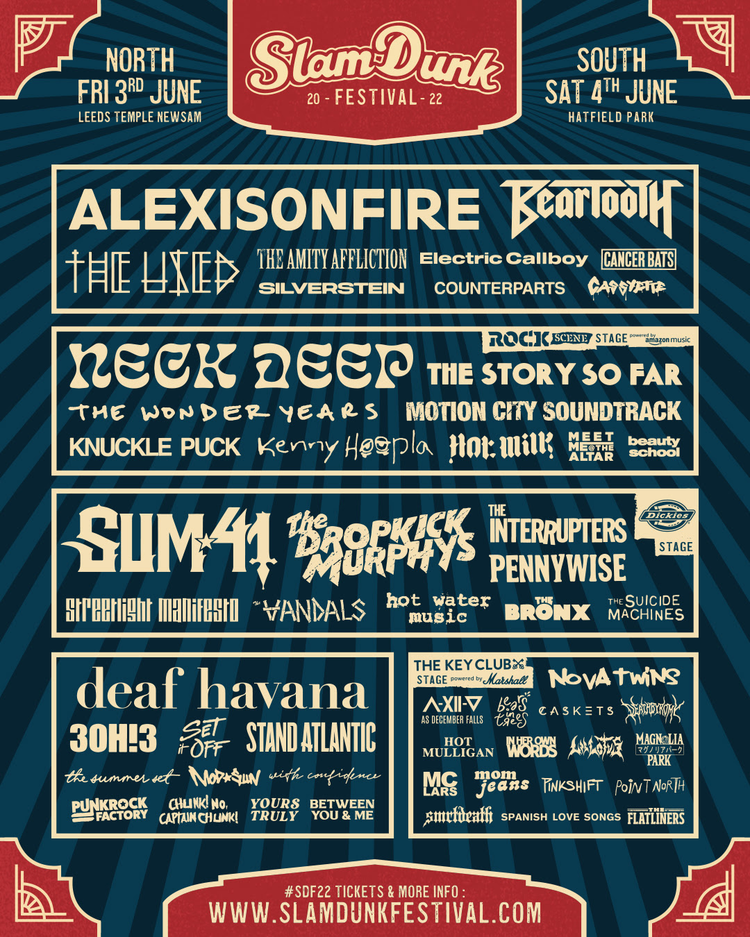 Slam Dunk Festival 2022 approaches at less than two months away, taking place over June Bank Holiday Weekend, Slam Dunk Festival has revealed stage splits for its tremendous lineup. Headliners Neck Deep, Alexisonfire, Sum 41 and Dropkick Murphys and countless more bands. See the splits below.
