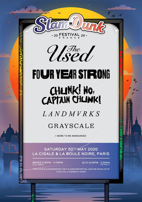 The wildly successful Slam Dunk Festival is coming to Paris France this spring. The European version of the UK’s best independent alternative festival for pop-punk and rock will take place on May Bank Holiday Weekend and has booked The Used, Four Year Strong, Chunk! No Captain Chunk!, Grayscale, and Landmvrks. Five more bands will be added to the fest taking over two venues in Paris, France on Saturday 30th at La Boule Noir and La Cigale. The 2020 UK Slam Dunk will take place at Leeds Temple Newsam and Hatfield Park on Saturday 23rd and Sunday 24th May. The two adjacent venues are set to welcome 10 outstanding artists; five of which have been announced today. Tickets for Slam Dunk Festival France will go on sale on Thursday 24th January and tickets for the UK event are on sale now at the link below.