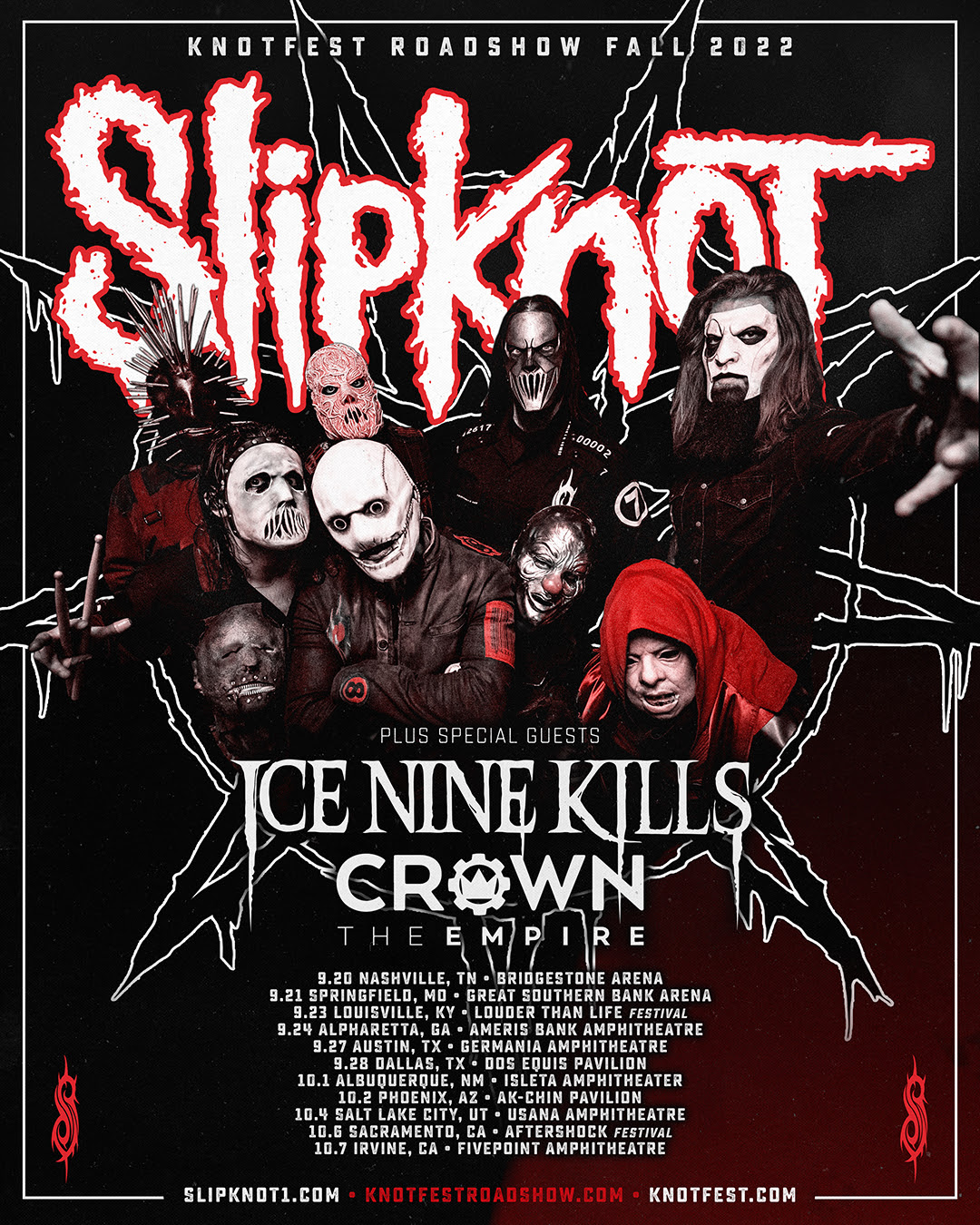 Slipknot has announced today that it will be hitting the road for its fall tour, Another leg of the Knotfest Roadshow 2022 tour, this time with horror-themed metal maestros Ice Nine Kills and metalcore titans Crown The Empire. Produced by Live Nation, the run will kick off on September 20 in Nashville, Tennessee and hit an additional eight cities before culminating in Irvine, California on October 7th. These dates also include festival appearances at Danny Wimmer Presents festivals Louder Than Life and Aftershock. Check out our coverage of leg one earlier this year and the pre-sale and on sale info below.