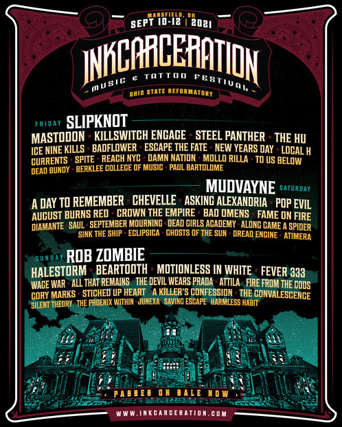 Metal and Rock Festivals are back! Inkcarceration Festival 2021 is a go as the first Danny Wimmer Presents fest we will get this year. The major lineup features Slipknot, Rob Zombie, Mudvayne, A Day To Remember, Mastodon, Chevelle, Killswitch Engage, Beartooth, Motionless In White, Asking Alexandria, Steel Panther, and more bands as well. Taking place at the historic Ohio State Reformatory in Mansfield, Ohio, September 10, 11 & 12th, the fest also features 75+ Tattoo Artists & Complimentary Tours Of The Prison Made Famous In The Shawshank Redemption. Single-day and weekend passes are on sale now at the link below.