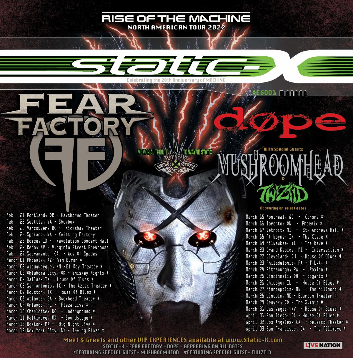 The tour will celebrate the 20th Anniversary of the band’s RIAA Gold-certified sophomore album Machine which is being re-released next year and will serve as a continuation of their memorial tribute to honor their late singer Wayne Static. Joining the touring Static-X lineup of Tony Campos, Koichi Fukuda, Ken Jay, and Xer0, will be fellow industrial metal pioneers Fear Factory and Dope, along with special guests Mushroomhead and Twiztid (appearing on select dates).