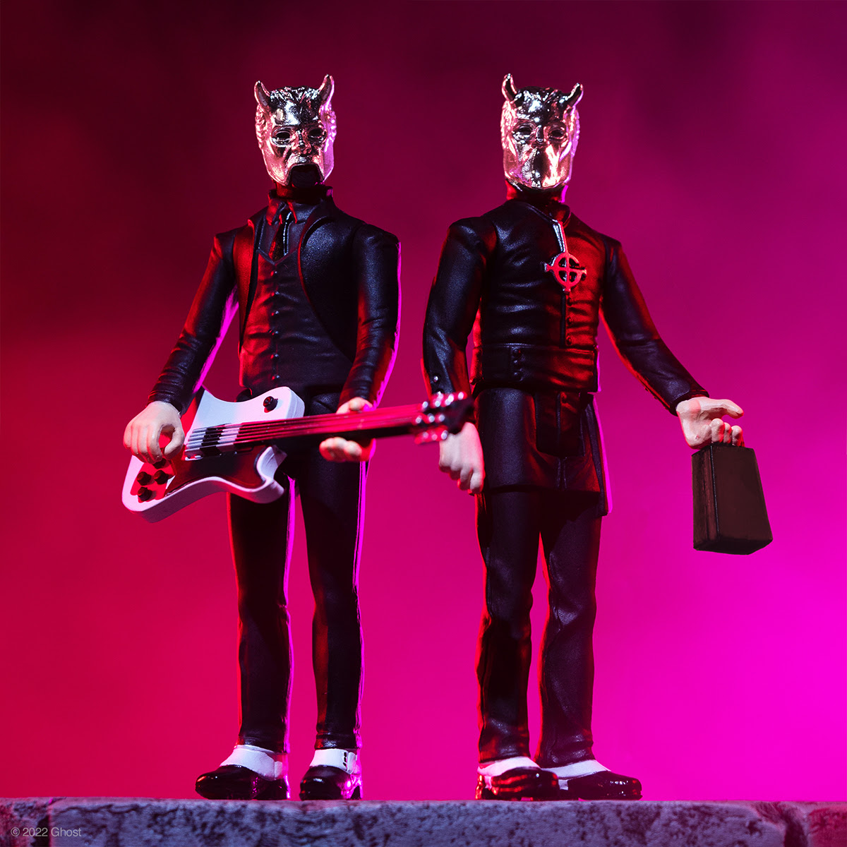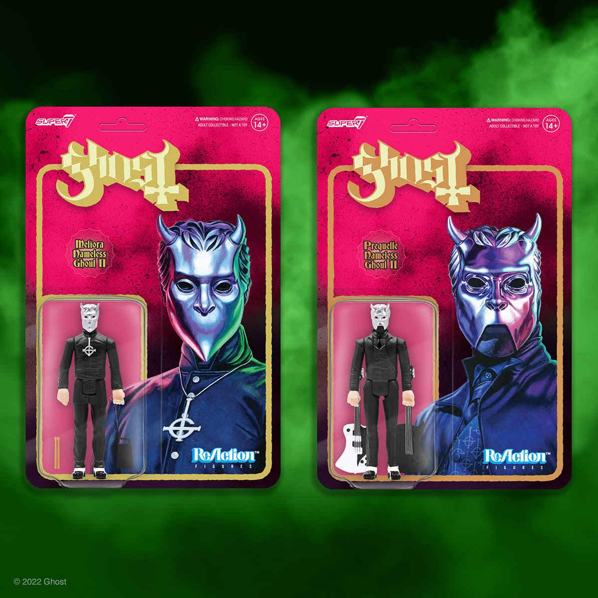 Super7 Toys has released new versions of their Ghost band Nameless Ghouls ReAction figures and a glow-in-the-dark “Ghostferatu” Papa Emeritus figure, all inspired by their acclaimed album Prequelle. Order it now in its new aquamarine color! In addition to the ReAction figures, Super7 has released a Slayer Live Undead playset as well as figures based on other music, movies, toy lines, and other pop culture icons. Other reaction figures in the line include Ozzy Osbourne, Cliff Burton of Metallica, Johnny Cash, Misfits, Alice Cooper, several versions of Papa Emeritus, Iron Maiden, Slayer, Agnostic Front, Anthrax, Motörhead, Venom, Circle Jerks, Gorilla Biscuits, King Diamond, Megadeth, Rancid, Judas Priest, Napalm Death, Paul Baloff of Exodus and many more! Order right now since these usually sell out.