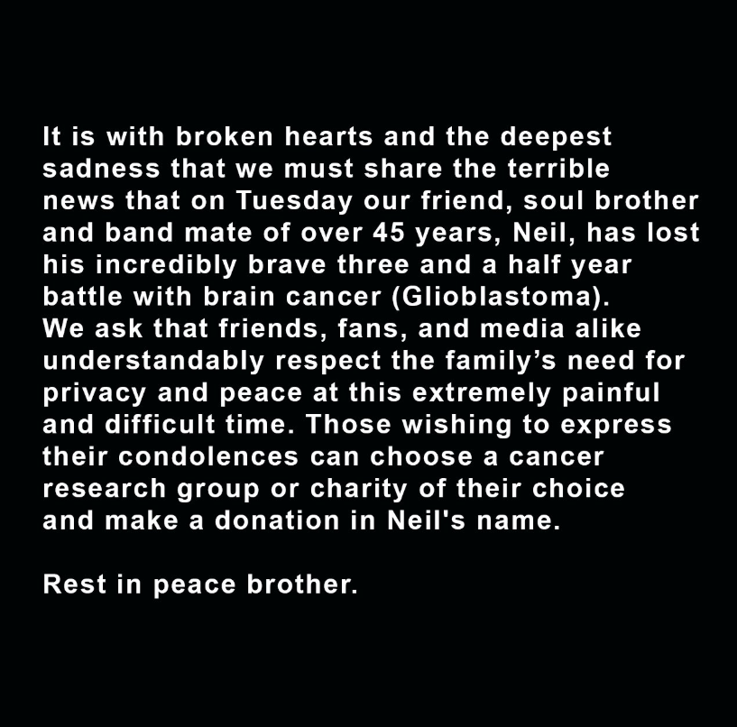 Absolutely Horrible News. Neal Peart has died after fighting brain cancer for years. His later life was filled with so much family tragedy. So, so sad. I’m just shocked. pic.twitter.com/EM4Ea1quaY