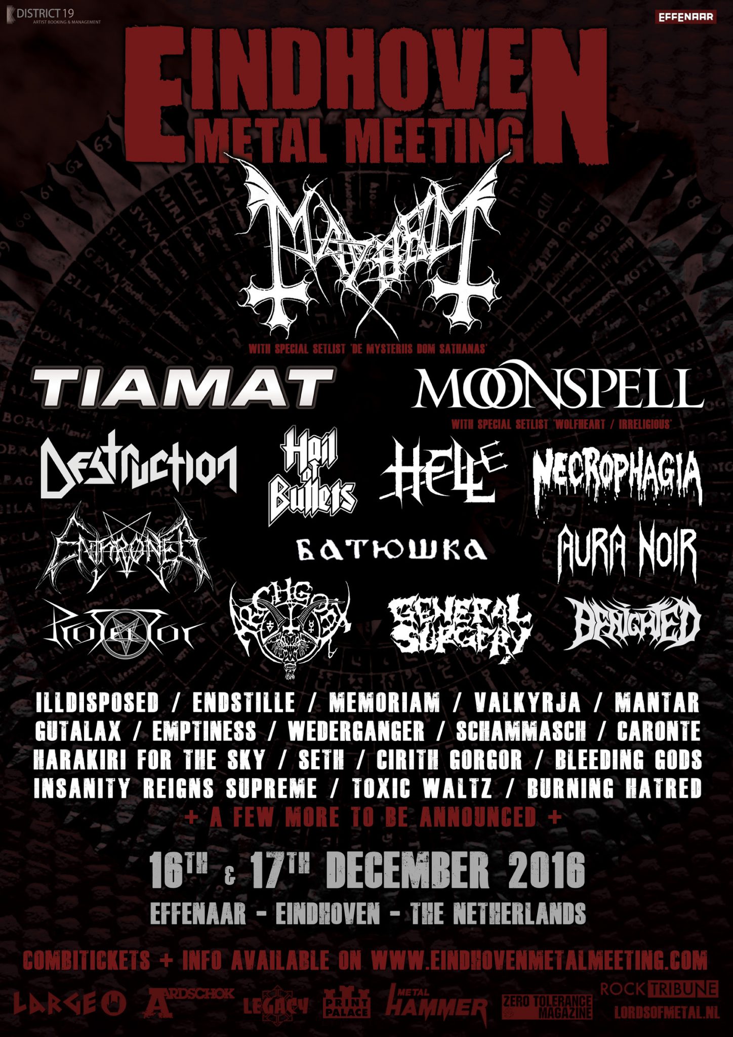 The storied Eindhoven Metal Meeting will take place for the 8th time this December 16th -17th at the Effennar in Eindhoven, NL. The fest has added new bands to the bill such as Hail Of Bullets, Archgoat, Memoriam, Illdisposed, Valkyrja, Insanity Reigns Supreme & Burning Hatred. They join a lineup that already includes Mayhem performing all of De Mysteriis Dom Sathanas, Tiamat, Moonspell, Destruction, and more. More bands will be announced soon. Tickets are on sale at the festival’s website: