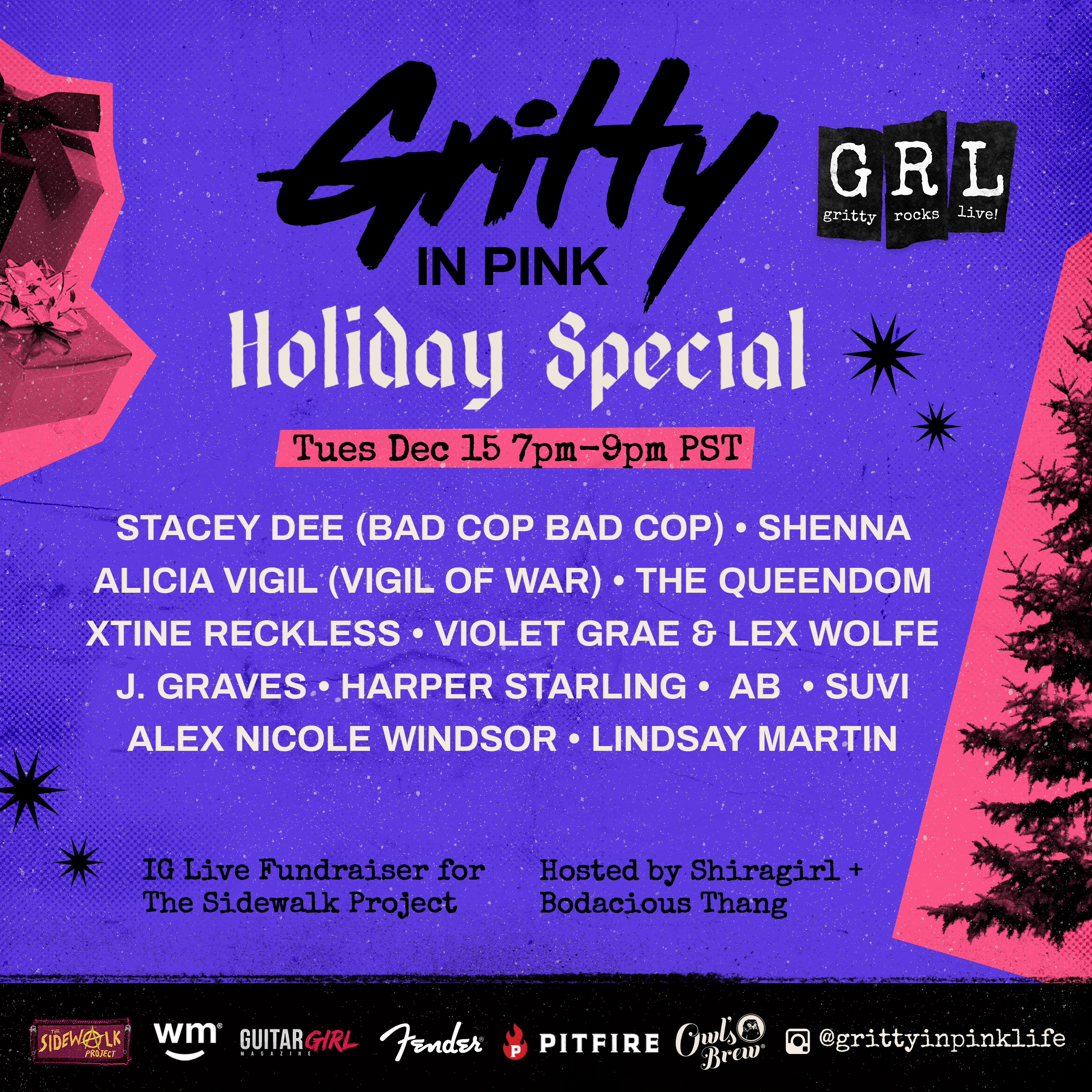 Gritty in Pink, a new platform empowering women in music, through performance, partnerships, and networking opportunities, wraps up their Historical Launch Year with a Holiday Special Live Fundraiser for The Sidewalk Project. The women’s centric artist livestream showcase will benefit houseless communities countrywide, tomorrow night, December 15 at 7 pm PST. In January of this year, Gritty began as a monthly concert at The Satellite in Los Angeles, but it was soon adapted to an online format due to the COVID-19 pandemic. Despite the setback, Gritty Rocks Live (GRL) launched virtual tours that featured female artists from cities all across the country, raising thousands of dollars for charities including ACLU and Headcount. The Holiday Special, hosted by Shiragirl and Bodacious Thang, will be a live fundraiser for The Sidewalk Project, benefiting houseless communities across the country.