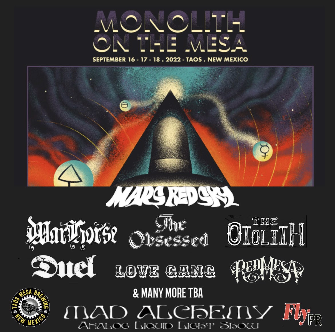 Monolith On The Mesa: Music And Art Festival returns to Taos, New Mexico September 16-17-18, 2022 with a killer lineup and experiences. Once again taking place at Taos Mesa Brewing The Mothership, the first wave of bands for the fest includes Mars Red Sky, The Obsessed, Warhorse, The Otolith, Duel, Love Gang, Red Mesa and visual magicians: Mad Alchemy Liquid Light Show. This year the festival will be open-air and focused around the “earthship” amphitheatre which holds 1,500 people. Upcoming festival announcements will detail efforts to make the event more eco-friendly, with less single-use plastic and other disposables. Passes are on sale now at the link below. Continue reading
