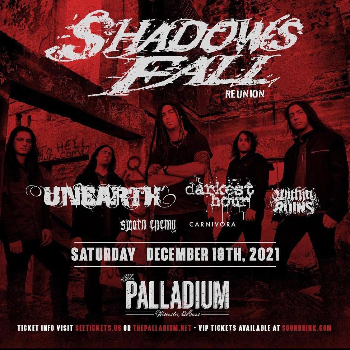 Legendary Metal band Shadows Fall have announced a one-off reunion show at their home venue, the recently renovated Worcester Palladium, for December 18th, 2021. Direct support will come from a hand picked lineup of Unearth, Darkest Hour, Within the Ruins, Sworn Enemy, and Carnivora! VIP Packages On-sale Wednesday, 6/23@ 10am est. general admission tickets On-Sale Friday, 6/25 @ 10am est. get them at Tickets are on sale now at the link below!