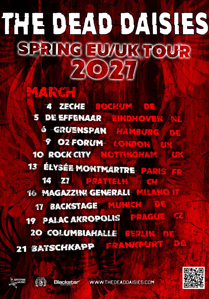 After touring five continents, visiting forty-seven countries, rocking 301 cities, playing 618 shows and clocking up thousands of miles, the guys will be itching to get back out there touring again and do what they do best, hitting the road and cranking it up nice and loud. The guys are now hard at work crafting new riffs, new songs and plenty of unapologetic, hard-hitting rock. With new music brewing, loud amps, big guitar riffs, soaring vocals, and driving rhythms, 2027 is shaping up to be one hell of a year, reminding everyone why live Rock still rules. Europe, UK – The Daisies are coming for you. See you down the front!