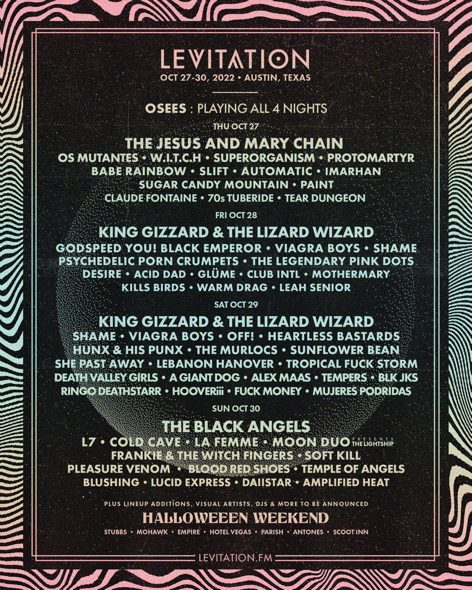 Infamous rock festival Levitation has announced its 2022 lineup! Headliners and support bands include The Jesus And Mary Chain, King Gizzard & The Lizard Wizard (2 Nights), The Black Angels, Os Mutantes, Osees, L7, Godspeed You! Black Emperor, Shame, Viagra Boys, Hunx & His Punx, W.I.T.C.H, Moon Duo, Off!, Sunflower Bean, Cold Cave, La Femme, Automatic, Protomartyr, Heartless Bastards, and many more to be announced soon! Four-day passes and single show tickets are on sale now! The fest takes place on Halloween weekend, October 27th-30th 2022, In Austin, Texas.