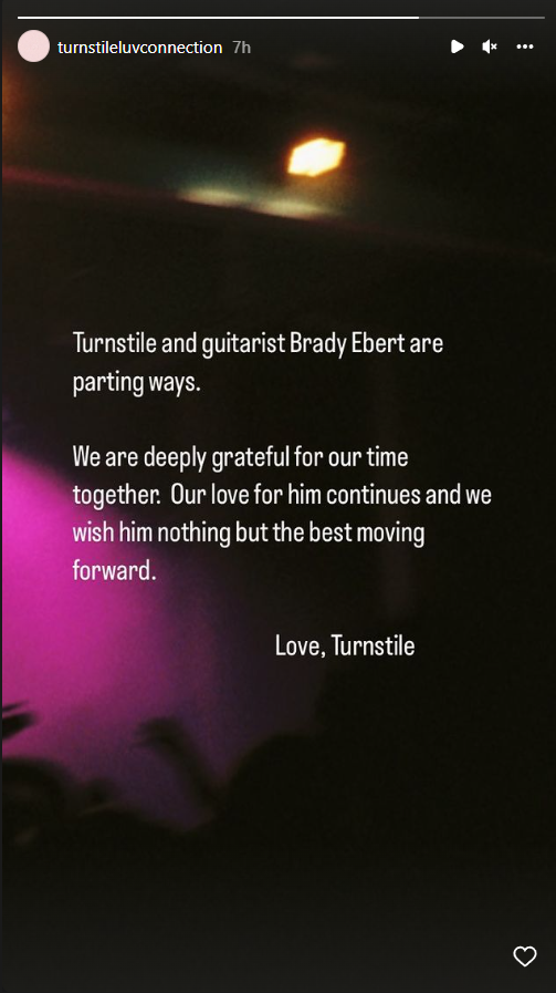 In a post to Instagram Stories, Turnstile has announced they have parted ways with founding guitarist Brady Ebert. Ebert co-founded the Baltimore hardcore band with vocalist Brendan Yates, bassist Franz Lyons, and drummer Daniel Fang in 2010. Their 2021 album Glow On topped many year end lists. The band has also become one of the most successful crossover bands in recent history with acclaimed albums and constant sold-out tours. Turnstile wrote.