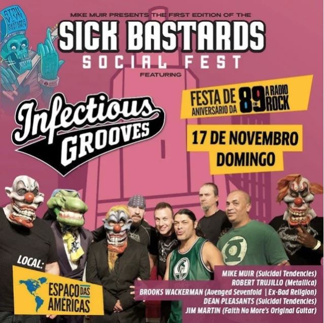 Infectious Grooves performed last night in Sao Paolo, Brazil as part of Sick Bastards Social Fest in Brazil. The band included frontman Mike Muir, Metallica bassist Robert Trujillo and ex-Faith No More guitarist Jim Martin, alongside Brooks Wackerman (Avenged Sevenfold) on drums and Dean Pleasants (Suicidal Tendencies) on second guitar. The event, which was curated by Muir, celebrated 34 years of the Brazilian radio station 89 A RĂ¡dio Rock. Also appearing with the band for “We Care A Lot” and a performance of the Suicidal Tendencies classic “Subliminal” was Trujillo’s son Ty. Fan-filmed video footage of the performance can be seen below.