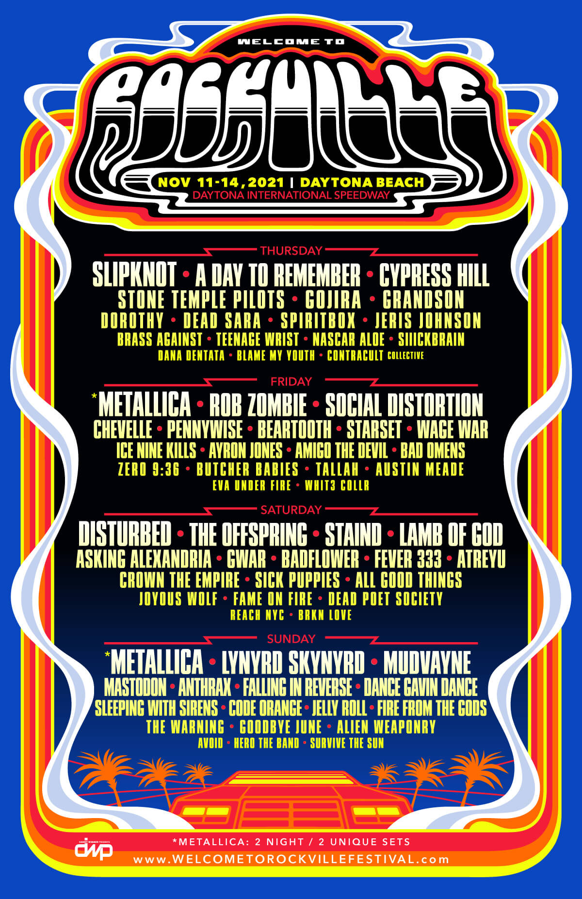 Held at its new home at the world famous Daytona International Speedway in Daytona Beach, Florida from November 11-14, the milestone 10th edition of Welcome To Rockville expands to four days for the first time ever this year and offers a can’t-miss lineup of amazing musical talent, including the final stop in the DWP x Metallica partnership as the metal giants perform two unique sets over two nights, plus headlining sets from Slipknot and Disturbed. There will also be appearances from Rob Zombie, Lynyrd Skynyrd (in their last North Florida performance), A Day To Remember, The Offspring and many more.