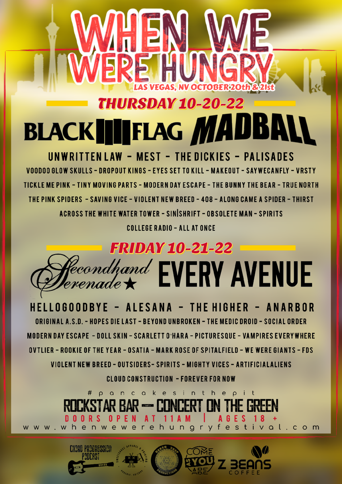 The inaugural When We Were Hungry Festival has announced its cancellation, due to unforeseen circumstances. The event was originally scheduled to take place on October 20 and 21 in Las Vegas at Rockstar Bar – Concert On The Green.is set to take place in Las Vegas, NV on Thursday, October 20 and Friday, October 21 at Rockstar Bar – Concert On The Green. The festival was to feature headlining performances from Black Flag, Madball, Secondhand Serenade and Every Avenue, the 18+ festival will cater to fans of punk rock, emo, and metal with some of the scene’s most popular acts from the past immersed with new up-and-coming talent.