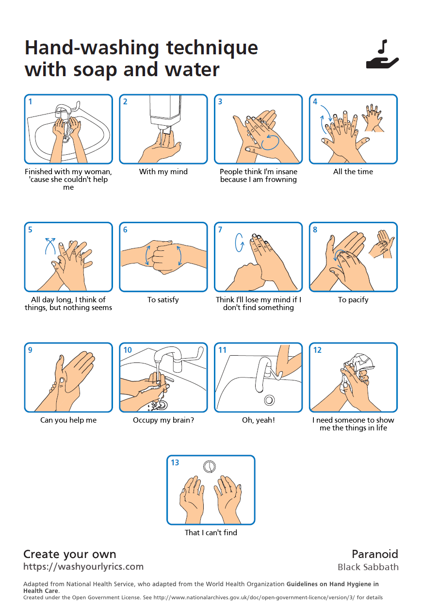 While everyone is freaking out about the Coronavirus, metal fans can remain calm and get some help with their hygiene. The advice from the Center for Disease Control (CDC) and The World Health Organization (WHO) is to not touch your face, wash your hands often and for at least 20 seconds. Some have made Tik-Tok’s of them singing songs to pas the 20 seconds. Now Twitter user William (@neoncloth) has created an awesome lyrics generator to help you wash your hands long enough. We chose Black Sabbath’s ‘Paranoid’, because it rules and everyone should know this song! These are not limited to metal or rock, but what is more metal than beating back a life-threatening virus?