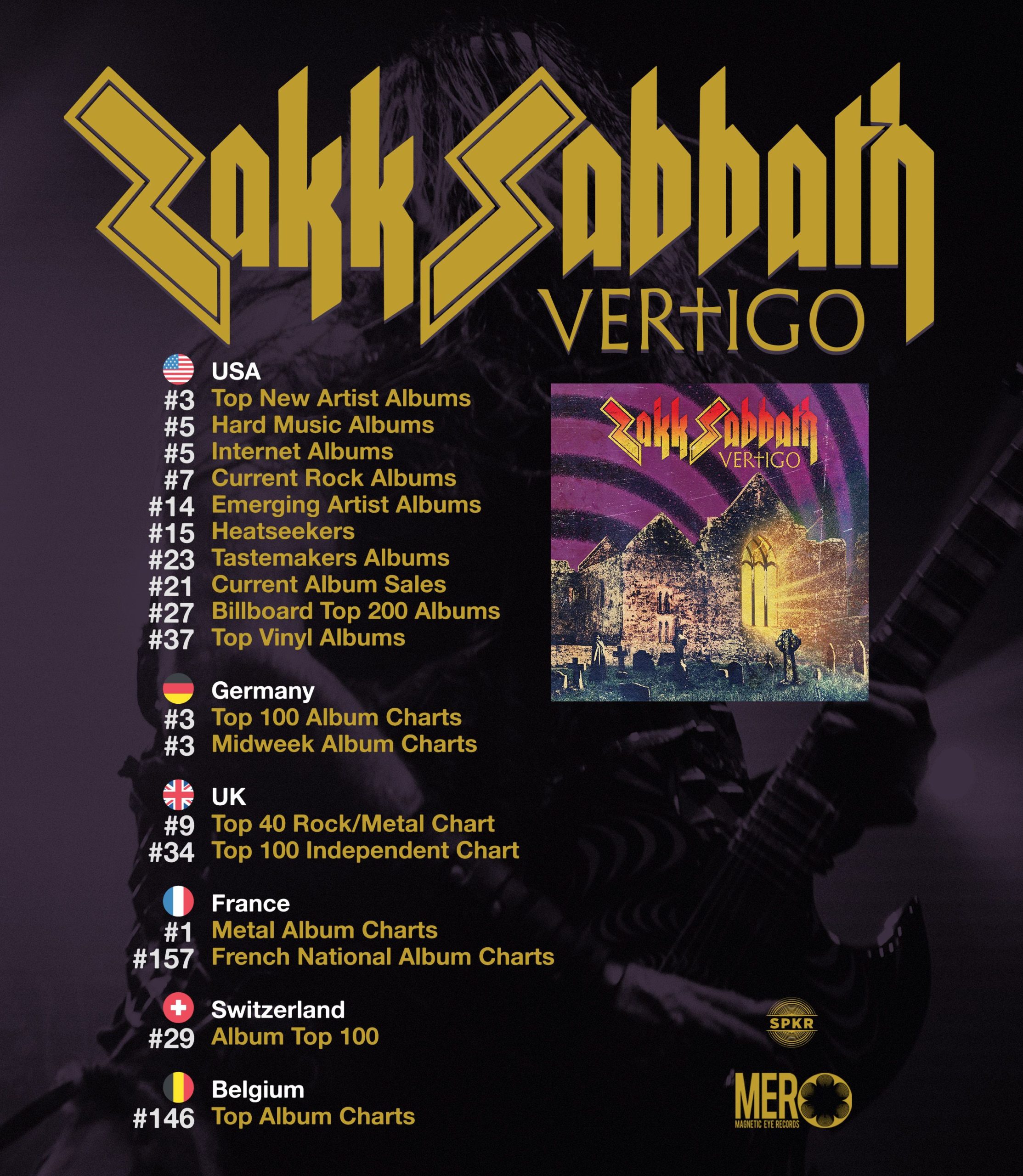 Zakk Sabbath, led by Black Label Society and Ozzy Osbourne shredder Zakk Wylde, has an unlikely hit on their hands. Released by the great label Magnetic Eye, known for sick bands, tons of stoner doom original releases, and tribute albums, Vertigo, is a tribute to Black Sabbath’s historic debut album which invented heavy metal and doom metal and turned 50 in 2019. The album, released only in physical versions and without online streams still ranked worldwide on the charts, due to physical sales (Deluxe CD vinyl). The label issued a statement on the release in light of charting., which you can see below. Zakk Sabbath also includes legends of rock and metal such as bassist Blasko (Ozzy Osbourne, Rob Zombie), and drummer Joey Castillo (Danzig, Queen Of The Stone Age, Bloodclot),